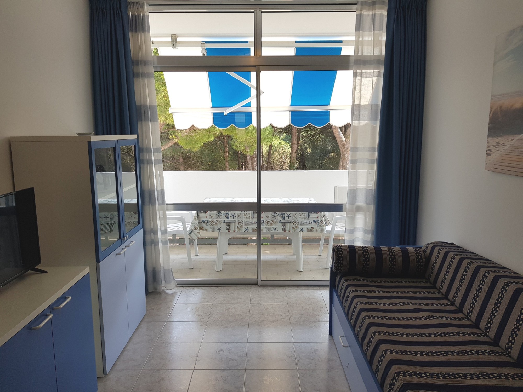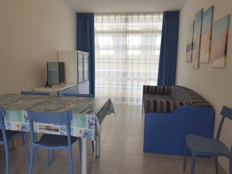 The three-room apartment is composed of a double bedroom, a bedroom with two single beds, bathroom with box shower, kitchenette with microwave, large living room with double sofa bed, TV, air conditioning (extra), WI-FI (extra), spacious living terrace equipped with awning that overlooks the pine woods and pools;