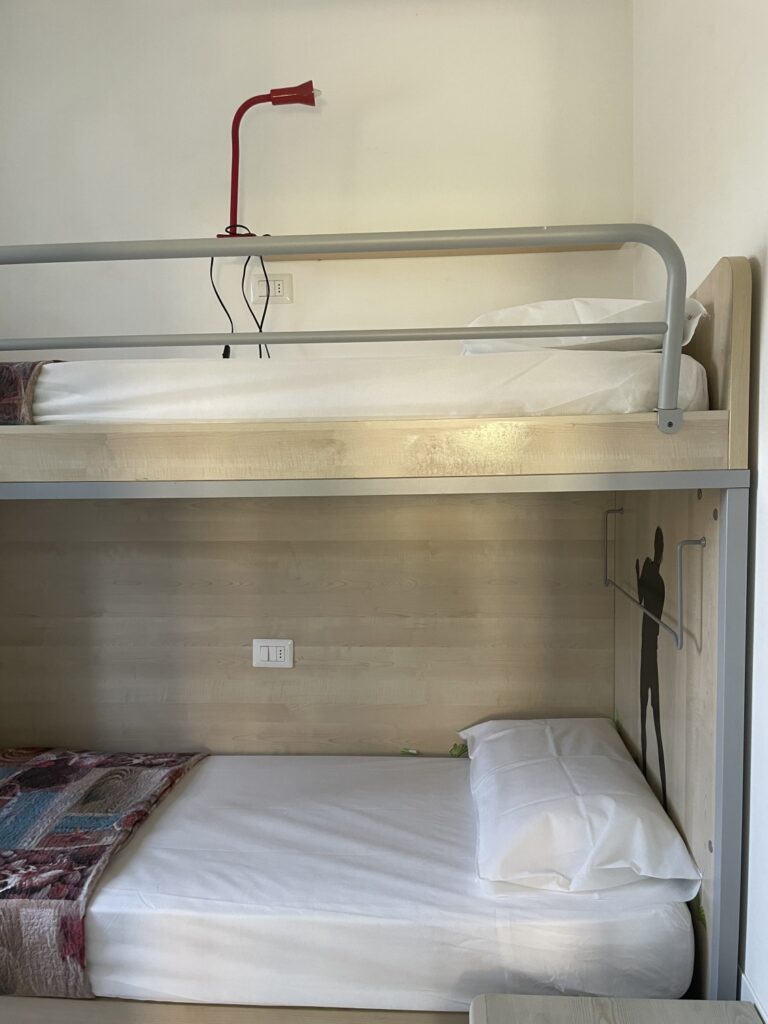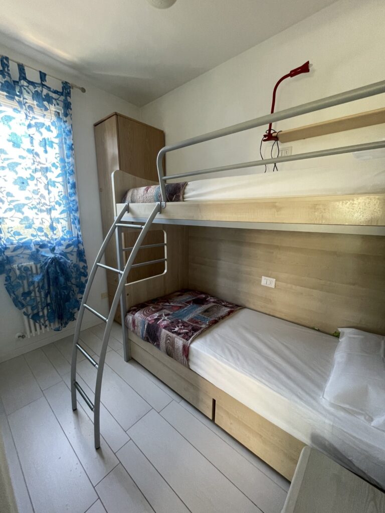 second bedroom with bunk bed, living room with double sofa bed and kitchenette, bathroom;